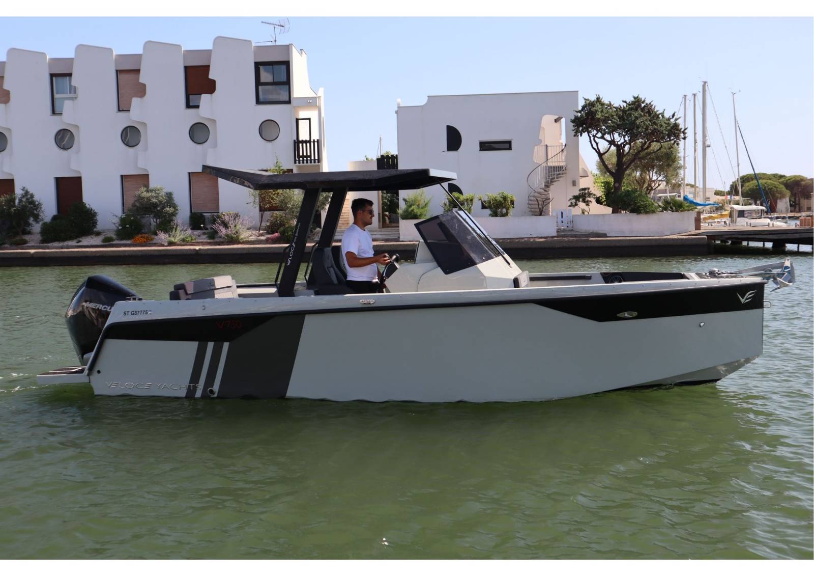 Le Veloce V750 Hard-Top est un bateau robuste et élégant de 7,50 mètres, conçu pour offrir confort et sécurité lors de vos sorties en mer, quelle que soit la météo. Équipé d’un puissant moteur Mercury V8 de 250cv, il garantit des performances remarquables et une navigation fluide.