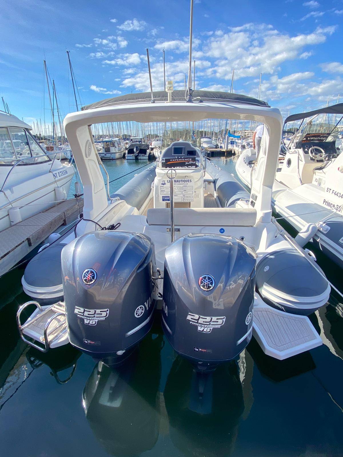 Propulsé par deux moteurs Yamaha de 225 CV, ce bateau assure une navigation fluide et sécurisante, même en mer agitée. Son comportement marin exemplaire et sa grande stabilité en font un excellent choix pour les amateurs de sensations comme pour les explorateurs en quête de confort.